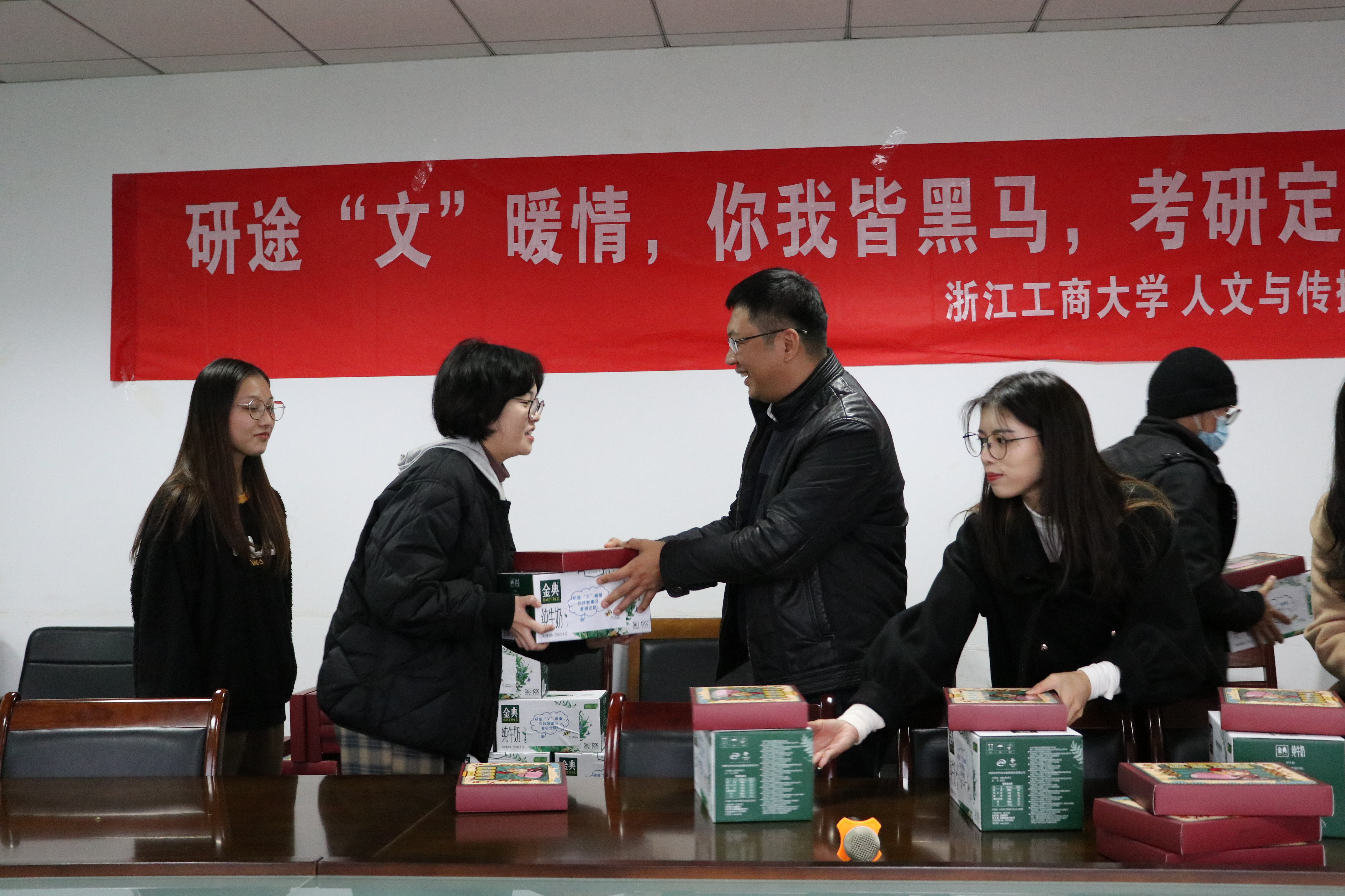 老师们还为考研学子精心准备了礼物——寓意身体强壮、牛气冲天的牛奶和寓意放平心态、信心满满的定胜糕。会后郑晓东书记亲自为考研学子送出礼物,表达了对同学们的殷切期盼,希望同学们牛气冲天,信心满满,考研定胜。