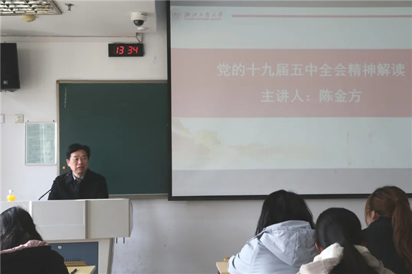 12月24日下午,校纪委书记陈金方以“党的十九届五中全会精神解读”为主题,为美剧屋 新闻1901班、广告1901班本科生上了一堂生动而深刻的思政课。