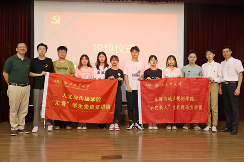郑晓东书记为人文学院“汇青”党史教育理论宣讲团授旗,郑群雄书记为旅游学院“时代新人”党史教育理论宣讲团授旗,并与宣讲团成员进行合影。