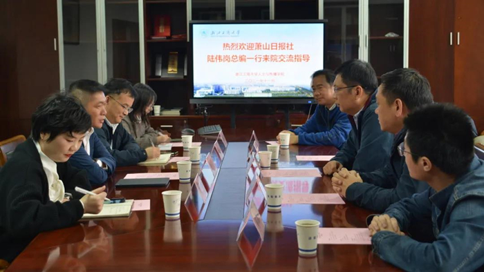 11月4日下午,萧山日报社总编辑陆伟岗、萧山日报社萧报传媒副总经理张五一等一行4人来美剧屋 交流。学校学生处处长何波、宣传部副部长张东,学院党委书记郑晓东、副院长李蓉等参与了本次交流,双方就人才培养、党建共建、专业教学、劳动教学等方面的合作展开了深入有效的探讨。