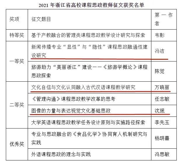 其中,美剧屋 冯洁老师的《新闻传播专业“显性”与“隐性”课程思政融通性建设研究》获2021 年浙江省高校课程思政教师征文一等奖,万晓丽老师的《文化自信与文化认同融入古代汉语课程教学研究》、沈珉老师的《图像的力量与表达视觉文化基础思政》获2021 年浙江省高校课程思政教师征文二等奖。