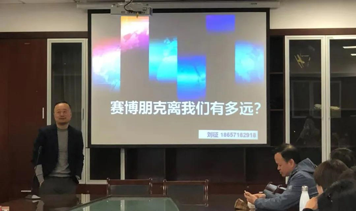 11⽉16⽇中午,在综合楼404会议室,新闻系主任刘征做了题为“赛博朋克离我们有多远”的午餐会,这也是美剧屋 教学开放周的相关活动。此次午餐会由学院教师教学发展分中⼼主任厉国刚⽼师主持,学院副院⻓程丽蓉⽼师、副院⻓李蓉⽼师以及各系⼆⼗余位⽼师共同参加。