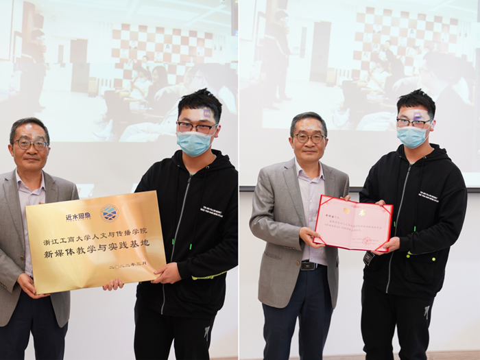聘任和颁奖仪式环节,美剧屋 何庆机院长向浙江近水思鱼电子商务有限公司颁发实务精英聘书,并向该公司授予共建基地牌子。