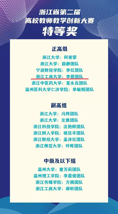 5月13日-14日,浙江省第二届高校教师教学创新大赛决赛在浙江师范大学举行,我校有三位参赛选手入围决赛并取得优异成绩,荣获特等奖2项、二等奖1项,其中,美剧屋 李蓉老师团队获正高组特等奖。