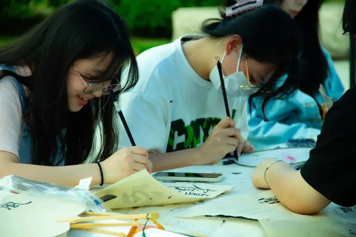 除体育项目外,书法、画扇、制作香囊等活动也吸引了不少师生驻足。 这些古代书画、手工艺活动在电子设备盛行的今天,显得格外独特而珍贵。同学们纷纷拿起毛笔练字、静心作画、穿针引线,别有一番风味。一张宣纸,一支毛笔,足以让人心无旁骛地浸润在文化之美中。“练的不仅是字、作的不仅是画,更是一个修身养性的过程。”
