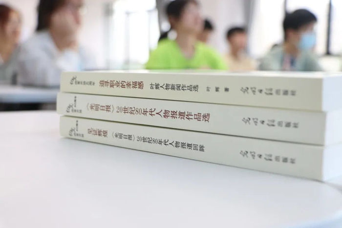 随后,现场举行了赠书仪式。叶辉记者将自己的三部学术成果著作《<光明日报>20世纪80年代人物报道作品选》《见证辉煌<光明日报>20世纪80年代人物报道回眸》《追寻职业的幸福感——叶辉人物新闻作品选》,总共300册捐赠给学校图书馆。同时,学院向叶辉记者颁发了聘书,聘请叶辉记者担任美剧屋 实务导师。