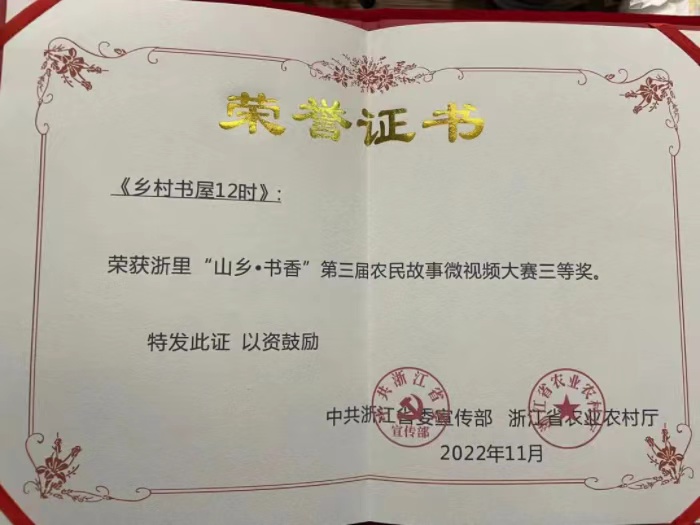 2022年11月1日,由省委宣传部、省农业农村厅主办的浙里“山乡·书香”第三届农民故事微视频大赛获奖结果公布。浙商大美剧屋 陈昱宏、竺佳宁、陈雨梦、鞠默驰同学参赛作品《乡村书屋12时》(指导老师:蒋三军、占佳聪)荣获三等奖的好成绩。该作品聚焦“乡村阅读”,以鑫藏修书屋创始人金旸的第一视角讲述,展示了农家书屋的日常特色、乡村孩子们的阅读故事。