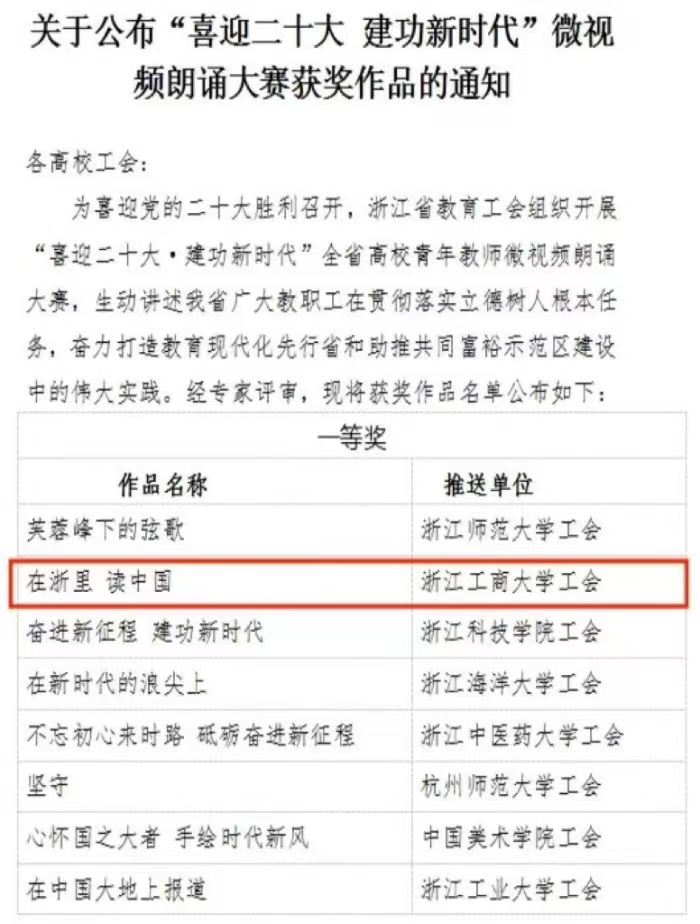 近日,浙江省教育工会发布《关于公布“喜迎二十大 建功新时代”微视频朗诵大赛获奖作品的通知》,美剧屋 中文系吴欣老师的朗诵作品《在浙里 读中国》荣获大赛一等奖。这首《在浙里 读中国》,是学院为此次大赛专门创作的原创作品。她有别于所有同类题材诗歌作品的表现角度,独辟蹊径,从教育工作者立德树人的视角出发,作为历史的见证者和亲历者,以大量新奇的比喻和丰富的想象,拟人化地表达出震撼人心的历史剧变和历史成就。
