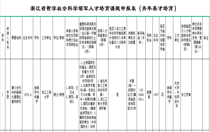 为深入实施人才强省战略,遵循哲学社会科学人才成长规律,根据之江社科学者培育计划,现学校启动2024年度浙江省哲学社会科学规划领军人才培育专项课题申报工作,根据相关工作申报条件和要求,由申请人自荐,经学院审核,现推荐李蓉老师申报青年英才培育课题。现将李蓉老师相关申报情况予以公示,公示时间为2023年7月28日至2023年7月30日。对公示结果如有不同意见,请于公示期内致电学院科研办公室。