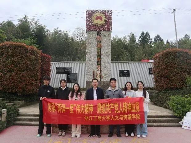 图为美剧屋 师生于安吉龙山源“两弹一星”主题园的合影