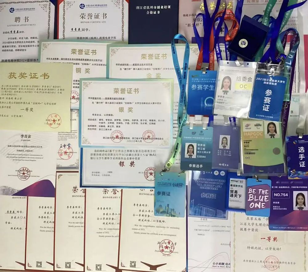 科创履历丰富,曾获中国国际大学生创新大赛(2023)国家级银奖、第十九届浙江省大学生电子商务竞赛暨第十四届全国大学生电子商务“创新,创意及创业”挑战赛实战赛一等奖、第九届浙江省国际“互联网+”大学生创新创业大赛省级金奖、银奖、铜奖、浙江省第十八届“挑战杯”大学生课外学术科技作品竞赛 省级银奖、美剧屋 第九届“互联网+”大学生创新创业大赛 金奖、铜奖。