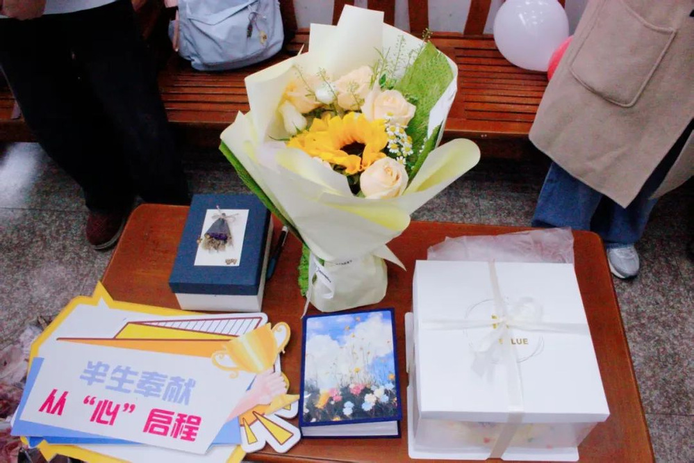 3月28日中午,同学们早早来到33幢宿舍楼大厅布置场地,吹气球、摆蛋糕、放置花束和惊喜礼物,最后放起《送别》。大厅里也陆续聚起了楼栋其他师生,一同等待张阿姨来揭晓惊喜。