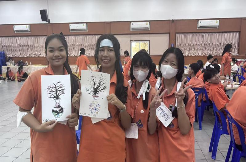 在完成日常教学任务之余,郑茜予主动联动泰国本土教师,共同策划举办中文文化营活动。活动涵盖端午五彩绳编织、吹墨画创作、红包手绘、中华美食品鉴等多个沉浸式体验项目,吸引全校逾200名学生踊跃参与,让中国传统文化在异国校园落地生根。泰国通索卡皮塔亚中学校长及校领导班子亲临活动现场,对活动的文化传播成效与教学创新价值给予高度肯定。
