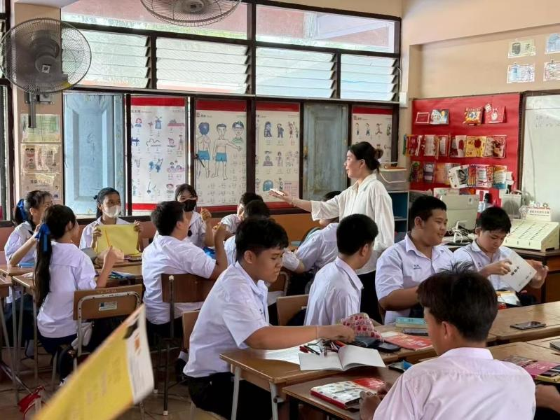 2025年5月,研究生郑茜予奔赴泰国通索卡皮塔亚中学,肩负起四个年级11个班的中文教学重任。针对学生中文水平参差不齐的现状,她以“提升汉语听说表达核心能力”为导向,精准设计分层教学方案,让不同基础的学生均能获得适配性学习体验。课堂上,她创新融合情境教学、游戏互动、任务驱动等多元方法,有效激活课堂氛围,显著提升学生参与度;同时巧用AI技术打造在线中文竞赛,通过汉字书写比拼、认读挑战、图文匹配等趣味活动,赋予教学更强互动性与时代感,充分点燃学生中文学习热情。